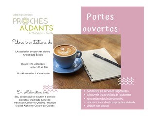 L’Association des proches aidants Arthabaska-Érable vous invite à ses toutes premières «Portes ouvertes» qui ont pour but de faire découvrir ses services et sa programmation automnale à ses membres et à toute la population de la région Arthabaska-Érable.